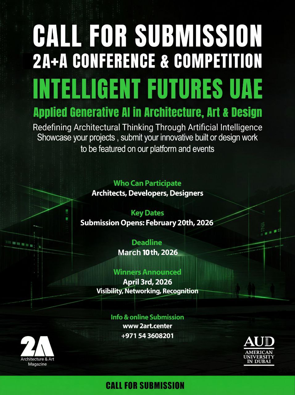 Participants may submit conceptual or realized projects that demonstrate innovation in smart architecture, advanced technologies, parametric design, sustainability strategies, and visionary urban solutions aligned with the future development of the UAE.
