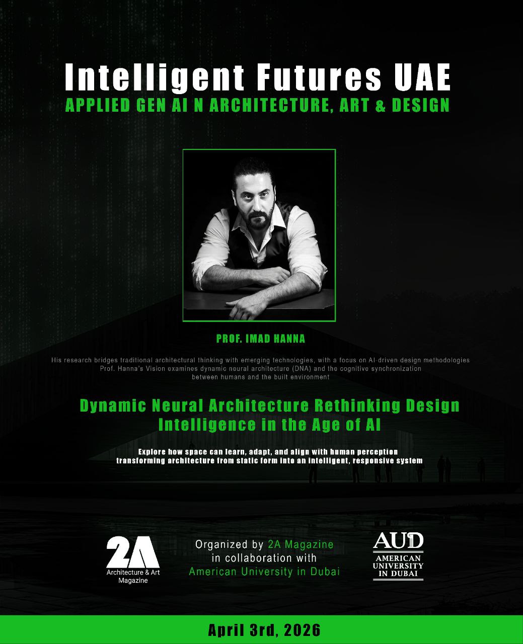 The 2A International Event brings together a major multidisciplinary program including the 2A International Conference, 2ACAA Award Ceremony, Intelligent Futures UAE Competition, and Visual Art & Design Exhibition.